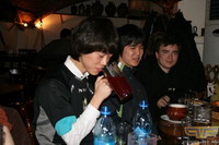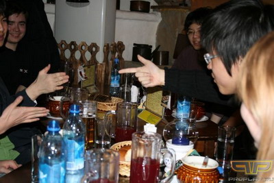 Наевшись булочек, корейцы захотели пить. К тому же, в зале было ужасно жарко, а ребята даже не догадались снять ветровки, пришлось им это посоветовать. Попросив воды без газа, мы услышали, что она кончилась, и сейчас за ней пошлют. Однако принесли морс, и корейцы были спасены от жажды. Вот только этот напиток им совсем не понравился - ребята пили его морщась, даже не скрывая того, что морс им неприятен, зато можно разыграть его в Камень-ножницы-бумага. Не припомню точно, как это звучит по-корейски (завтра уточню у Ремайнда), но выглядело и звучало это действительно весело. Мы просто как завороженные наблюдали, как народ веселится и хохотали вместе с ними. Морса надо было отпить примерно половину литрового бокала. Вначале два раза подряд проиграл Фокус (эти два дня для него были явно проигрышными), бедняга еле-еле тянул напиток во второй раз, что я обеспокоилась, как бы ему не стало плохо. Потом разок проиграл Мун. Забавно было наблюдать, как корейцы потешались над проигравшими и затаивали дыхание на каждом решительном моменте игры - мне тогда еще в голову мысль пришла - похоже, процесс каждой игры для них очень важен, однако как легко они принимали поражение... и никто не собирался отказываться от наказания или мухлевать во время игры.